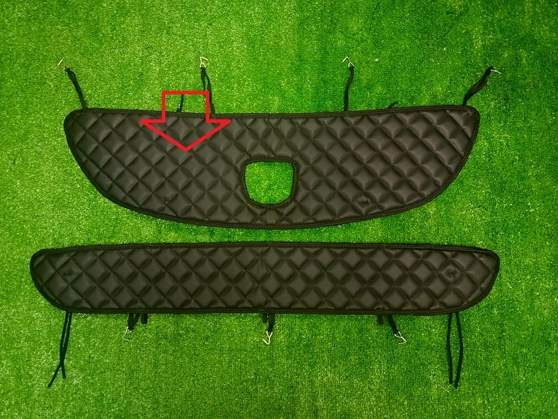 Установка зимней защиты решетки радиатора происходит путем привязывания нижних шнуров к решетке и закрепления верхних петель крючками под капотом . Крепление зависит от конструктивности и особенностей решетки автомобиля.